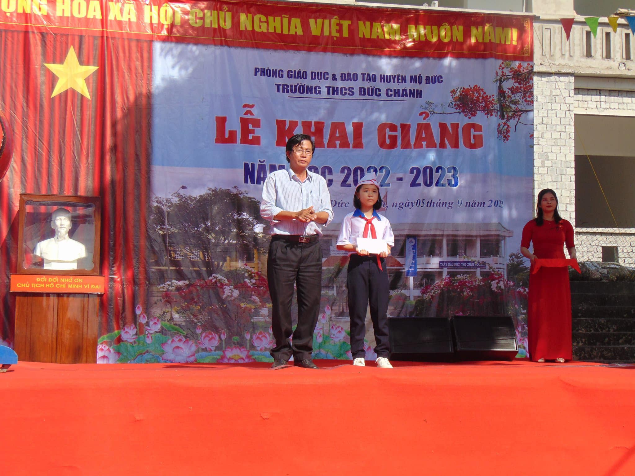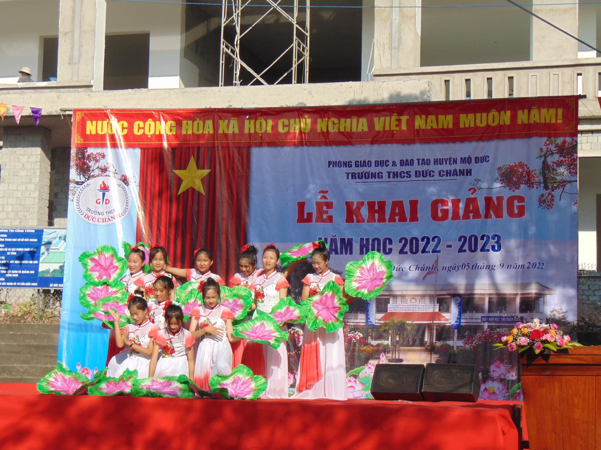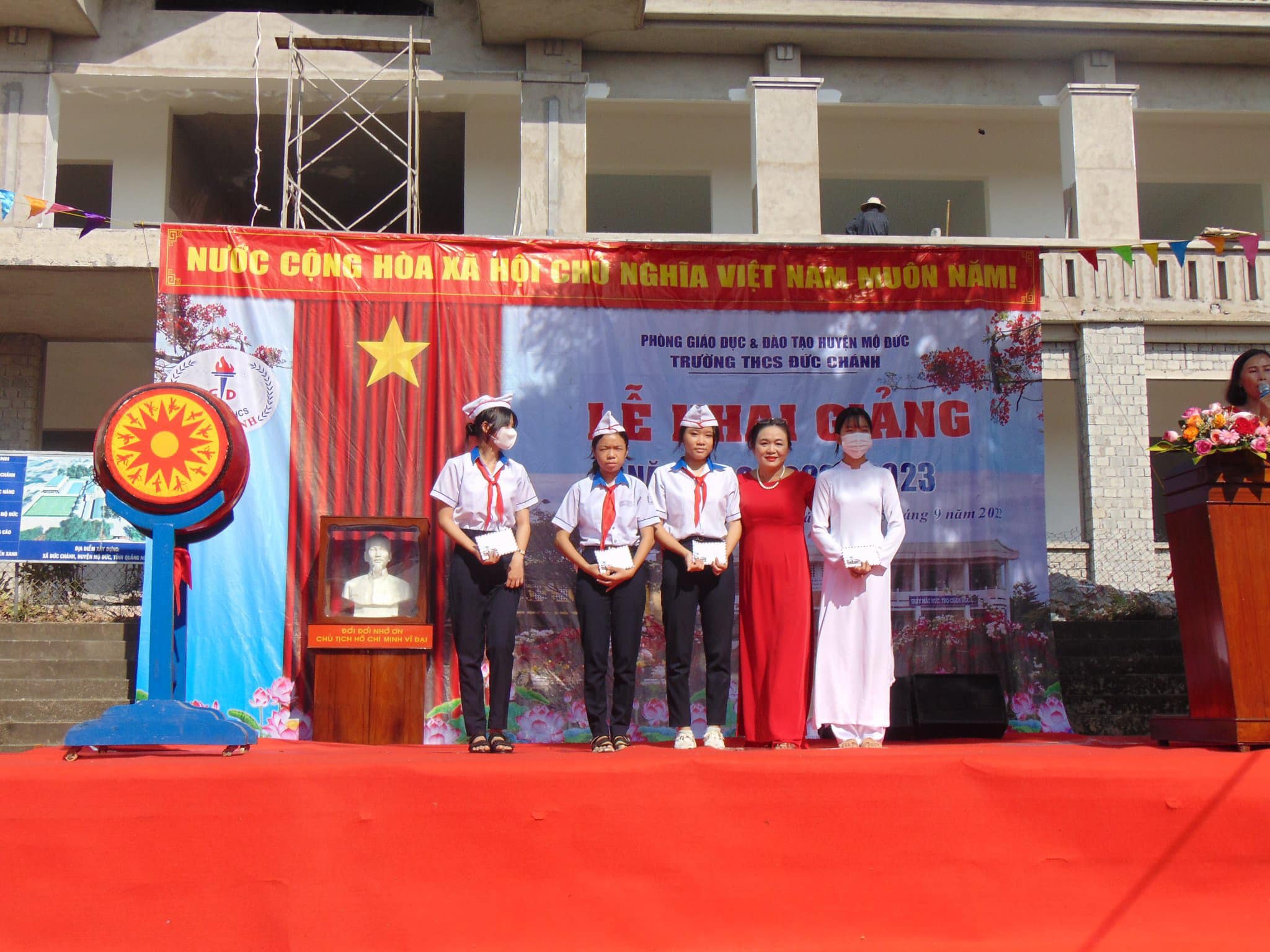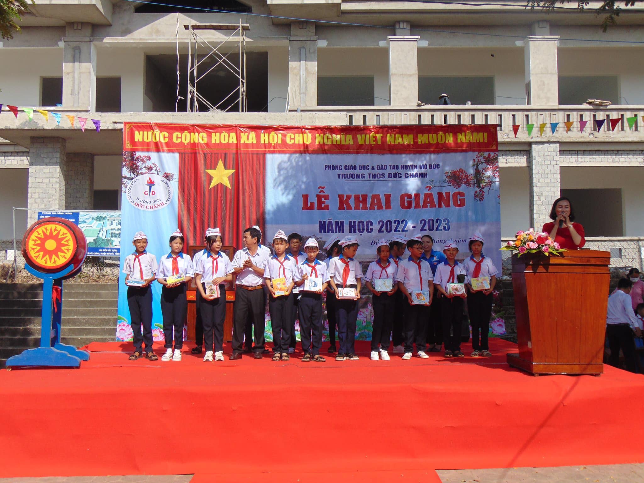 Hôm nay 05/9/2022 trường THCS Đức Chánh tổ chức lễ khai giảng năm học 2022-2023. Nhà trường vinh dự được chào đón lãnh đạo SGDĐT Quảng Ngãi, Hội khuyến học tỉnh Quảng Ngãi, Viettell Quảng Ngãi; lãnh đạo PGDĐT Mộ Đức, Hội khuyến học Mộ Đức; Viettell Mo Đức, Đảng uỷ, HĐND, UBND, UBMTTQVN xã Đức Chánh, Hội khuyến học, Hội LHPN, Đoàn thanh niên, Hội nông dân xã Đức Chánh; Đồn biên phòng Đức Minh; BTT Hội PHHS; CLB GV về hưu, Cựu học sinh, Công ty BH Bảo Minh; VNPT Mộ Đức, Công ty xây dựng và quảng cáo Hồng Bàng; nhà may Hữu Nghĩa; em Nguyễn Thị Mỹ Ly, Trần Thị Kim Hiền, Trần Nhất Duy, Trương Thị Hoài Thanh đã về dự , tặng hoa, trao quà, phát học bổng, phát thưởng, hỗ trợ chương trình Têt Trung thu cho HS. Cảm ơn anh Đoàn Văn Bảy- BTĐU xã Đức Chánh đã kết nối mạnh thường quân hỗ trợ học bổng cho HS. Cảm ơn đài phát thanh truyền hình tỉnh Quảng Ngãi, đài phát thanh truyền hình huyện Mộ Đức đến dự và đưa tin.
