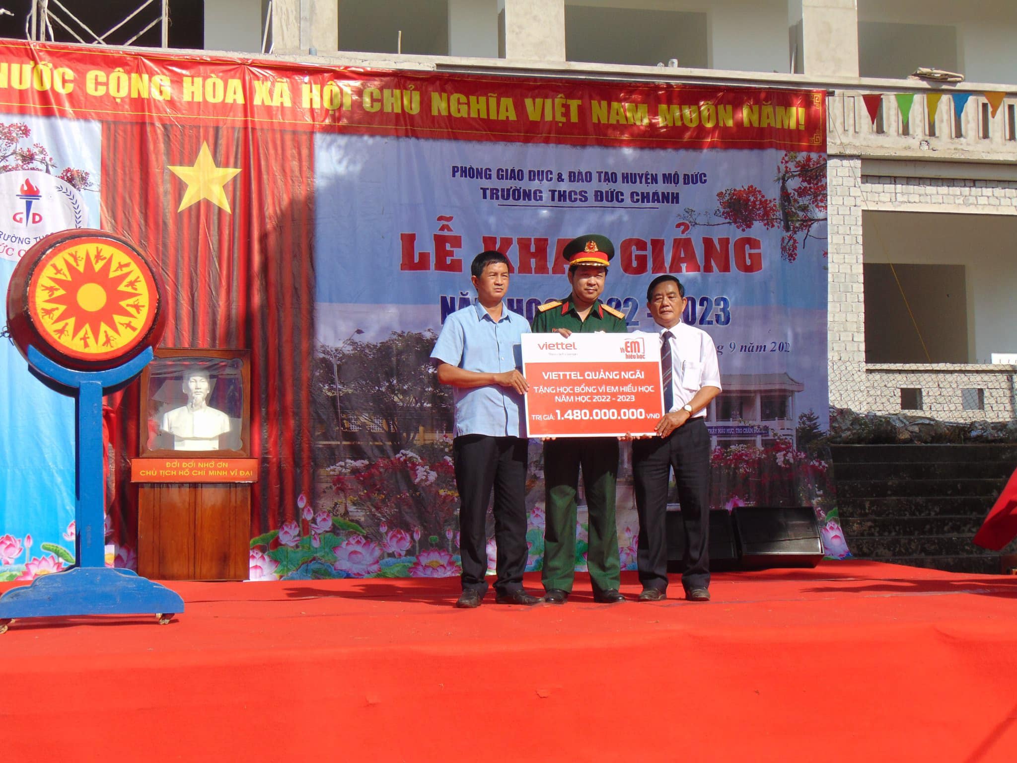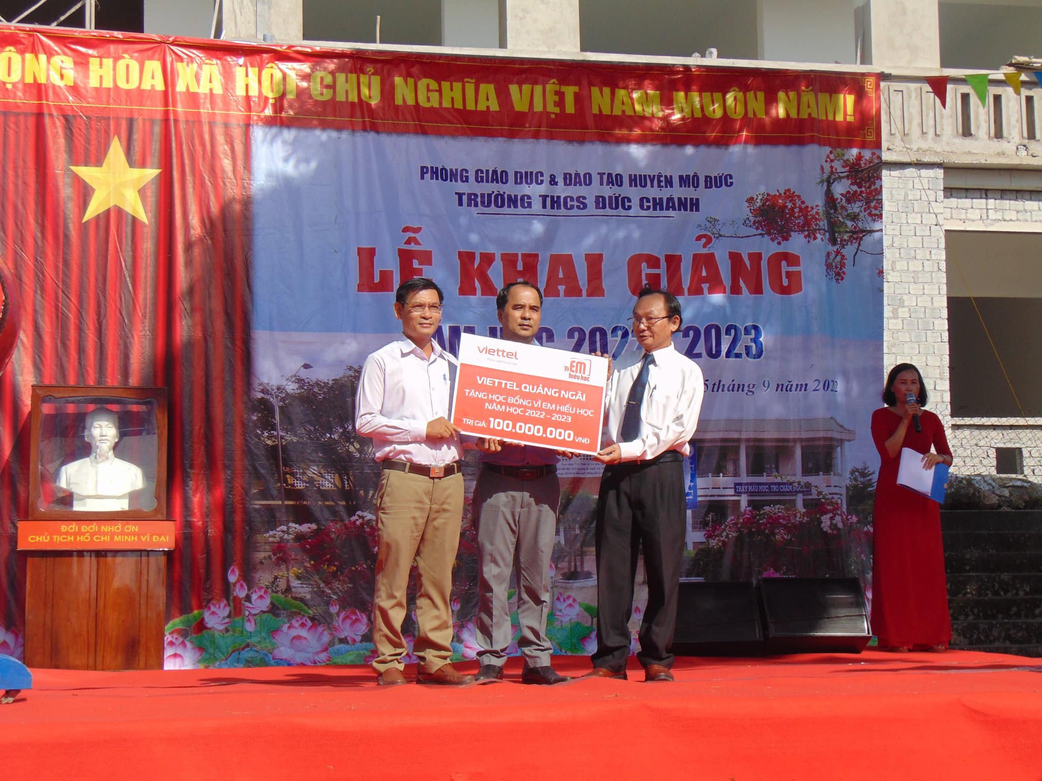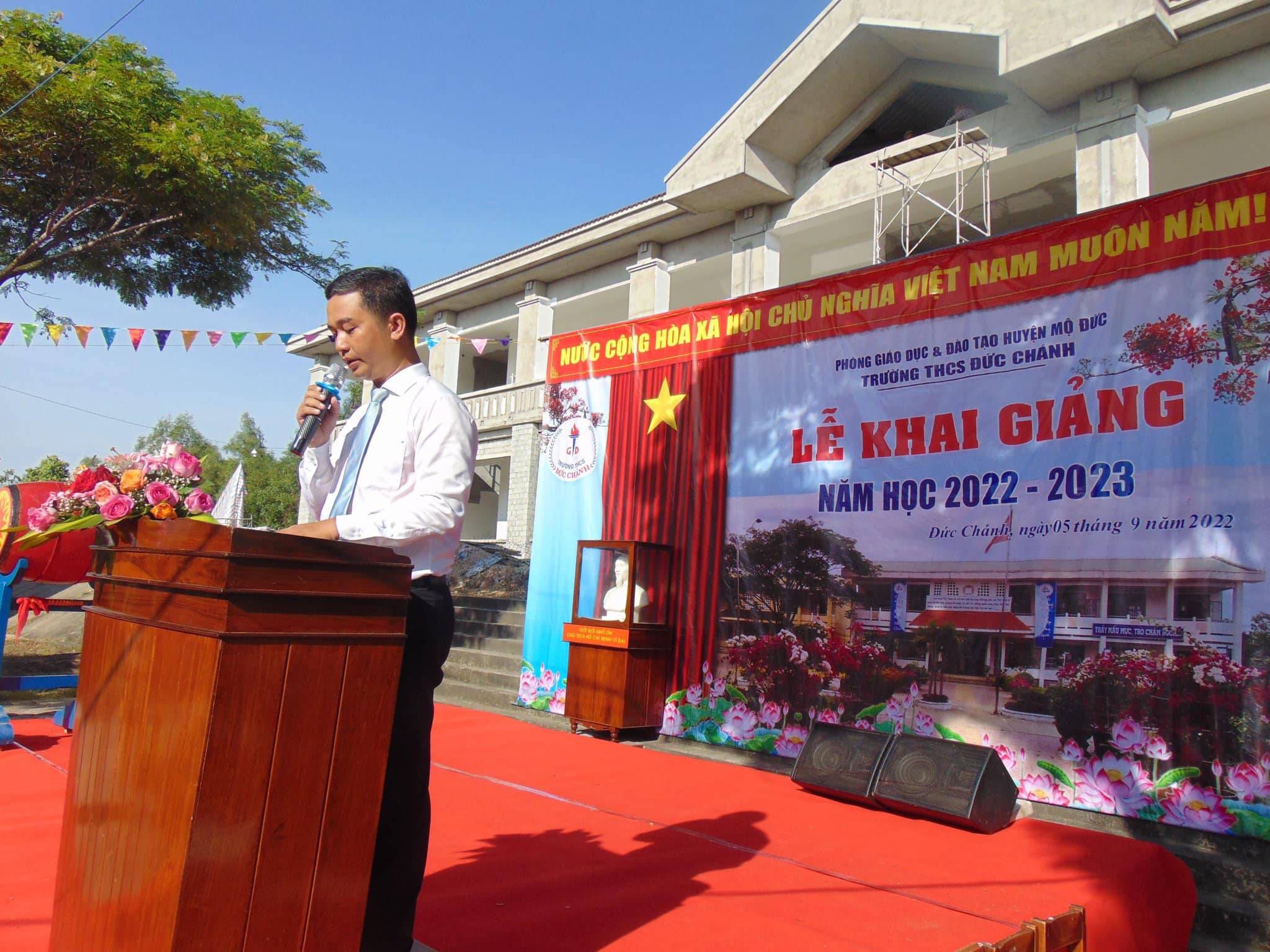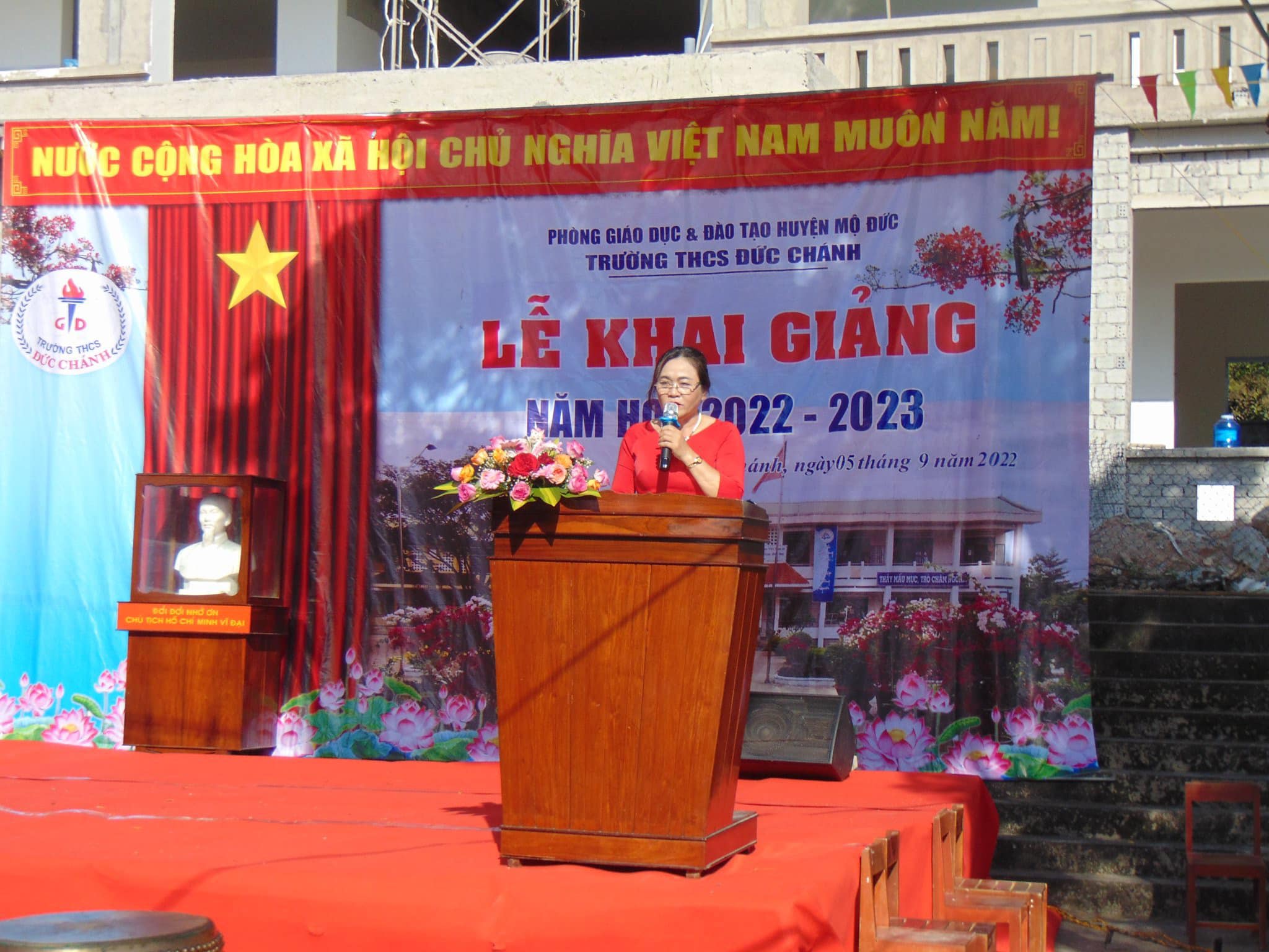 Hôm nay 05/9/2022 trường THCS Đức Chánh tổ chức lễ khai giảng năm học 2022-2023. Nhà trường vinh dự được chào đón lãnh đạo SGDĐT Quảng Ngãi, Hội khuyến học tỉnh Quảng Ngãi, Viettell Quảng Ngãi; lãnh đạo PGDĐT Mộ Đức, Hội khuyến học Mộ Đức; Viettell Mo Đức, Đảng uỷ, HĐND, UBND, UBMTTQVN xã Đức Chánh, Hội khuyến học, Hội LHPN, Đoàn thanh niên, Hội nông dân xã Đức Chánh; Đồn biên phòng Đức Minh; BTT Hội PHHS; CLB GV về hưu, Cựu học sinh, Công ty BH Bảo Minh; VNPT Mộ Đức, Công ty xây dựng và quảng cáo Hồng Bàng; nhà may Hữu Nghĩa; em Nguyễn Thị Mỹ Ly, Trần Thị Kim Hiền, Trần Nhất Duy, Trương Thị Hoài Thanh đã về dự , tặng hoa, trao quà, phát học bổng, phát thưởng, hỗ trợ chương trình Têt Trung thu cho HS. Cảm ơn anh Đoàn Văn Bảy- BTĐU xã Đức Chánh đã kết nối mạnh thường quân hỗ trợ học bổng cho HS. Cảm ơn đài phát thanh truyền hình tỉnh Quảng Ngãi, đài phát thanh truyền hình huyện Mộ Đức đến dự và đưa tin.