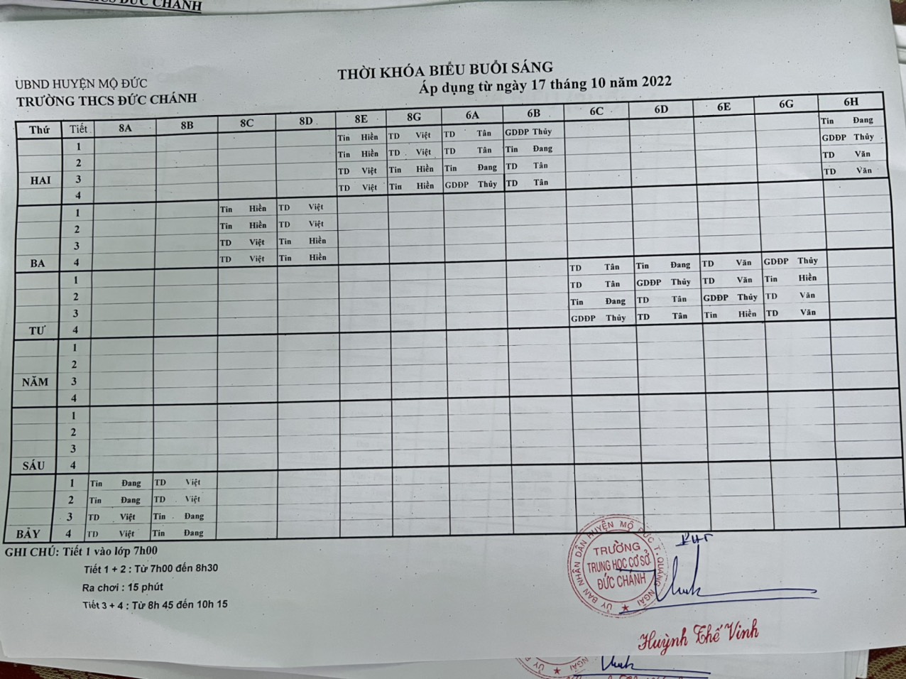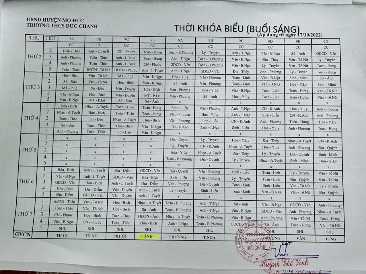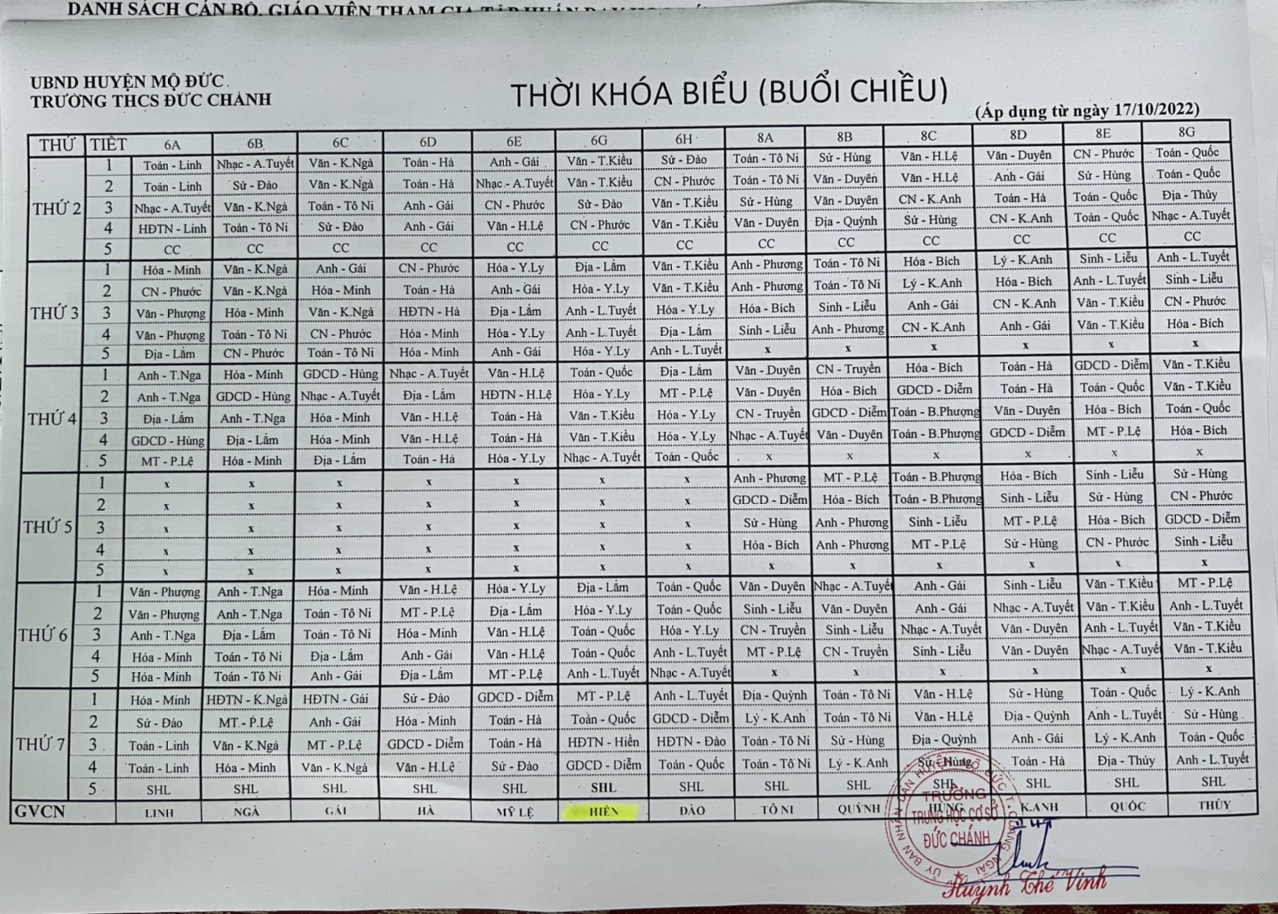 THỜI KHÓA BIỂU (áp dụng từ ngày 17/10 đến 22/10/2022)